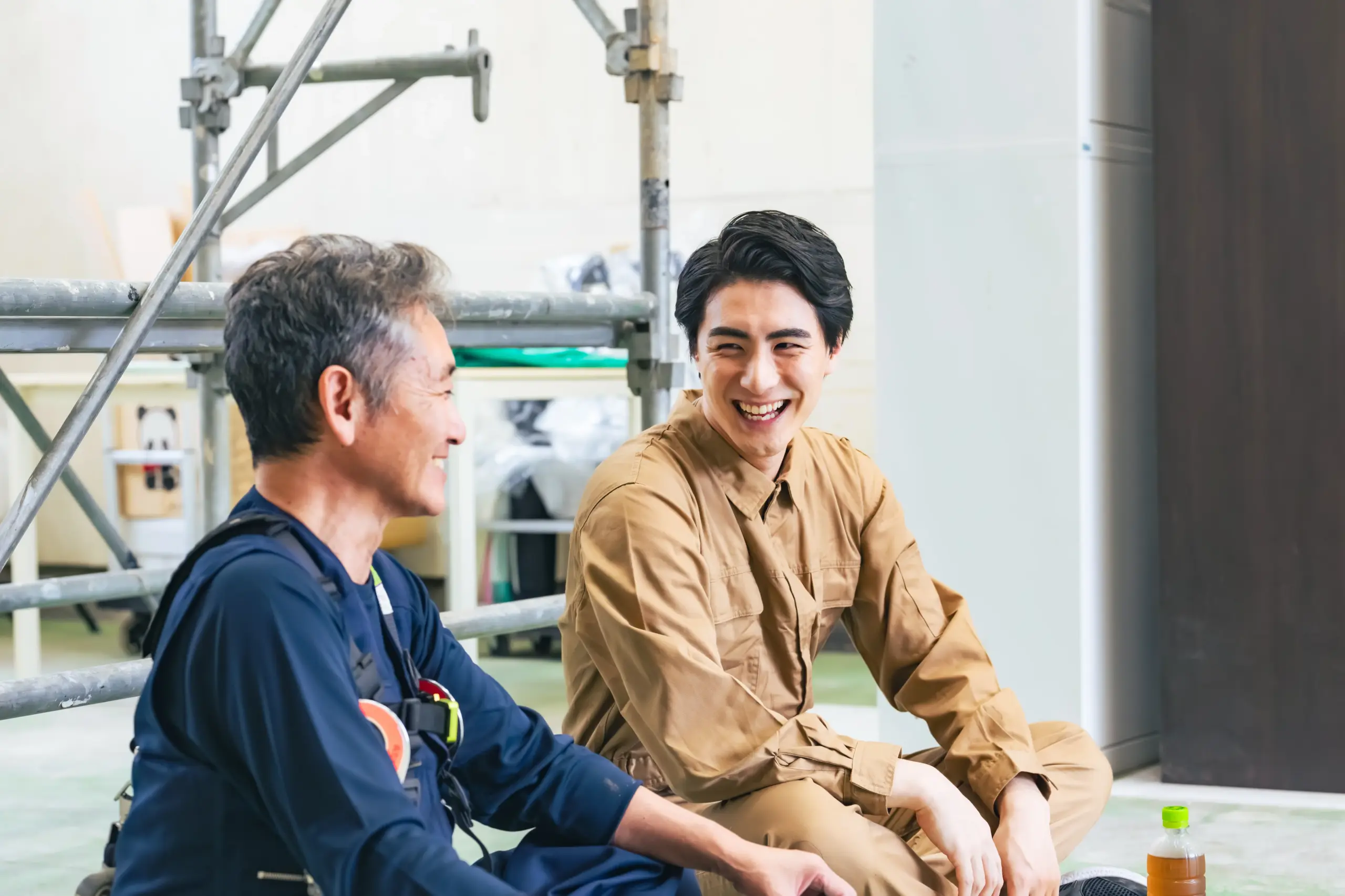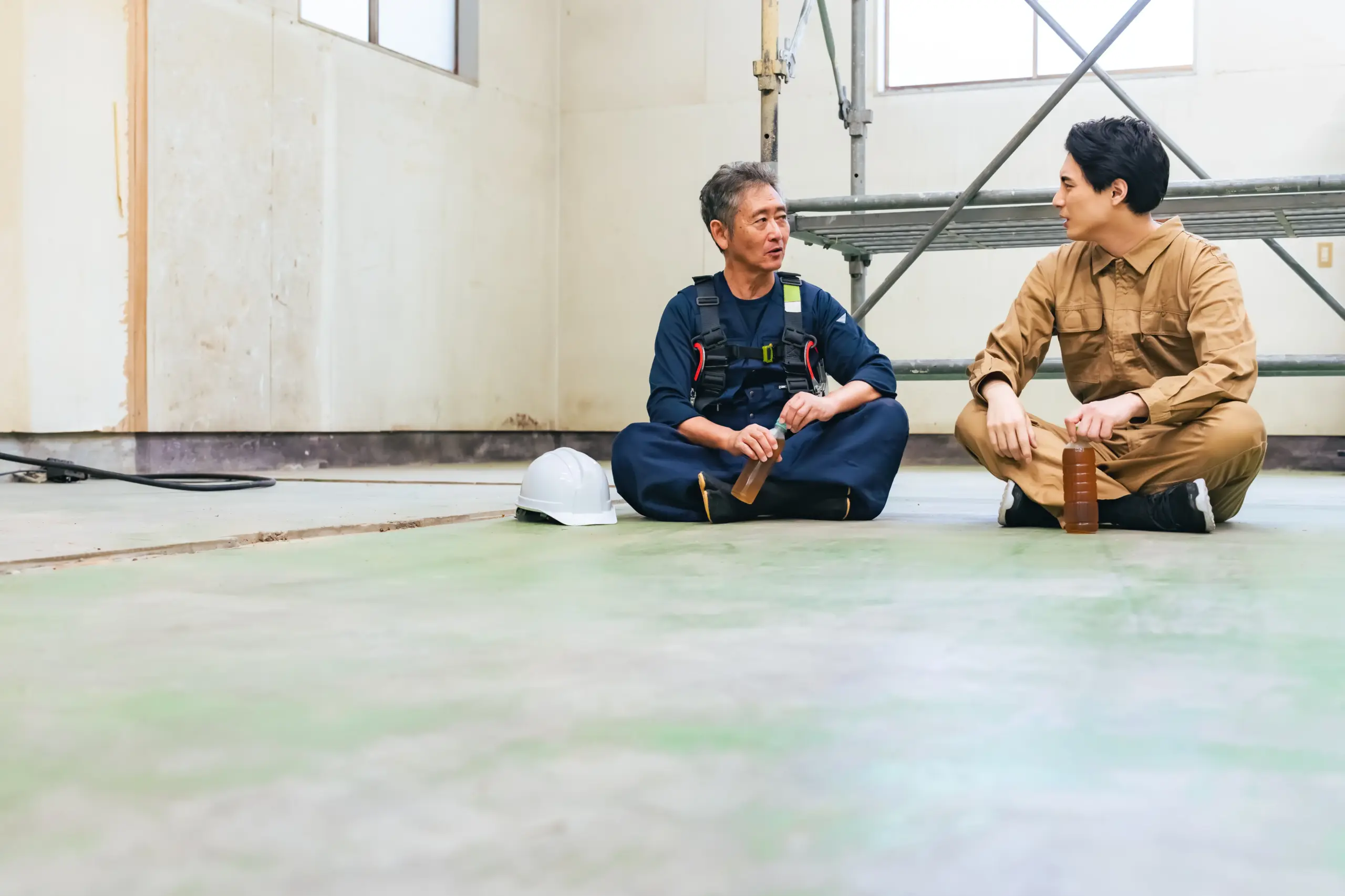 補修や防水などの仕上げ作業を丁寧に。 先輩が作業を確認しながら、効率よく安全第一で進めます。